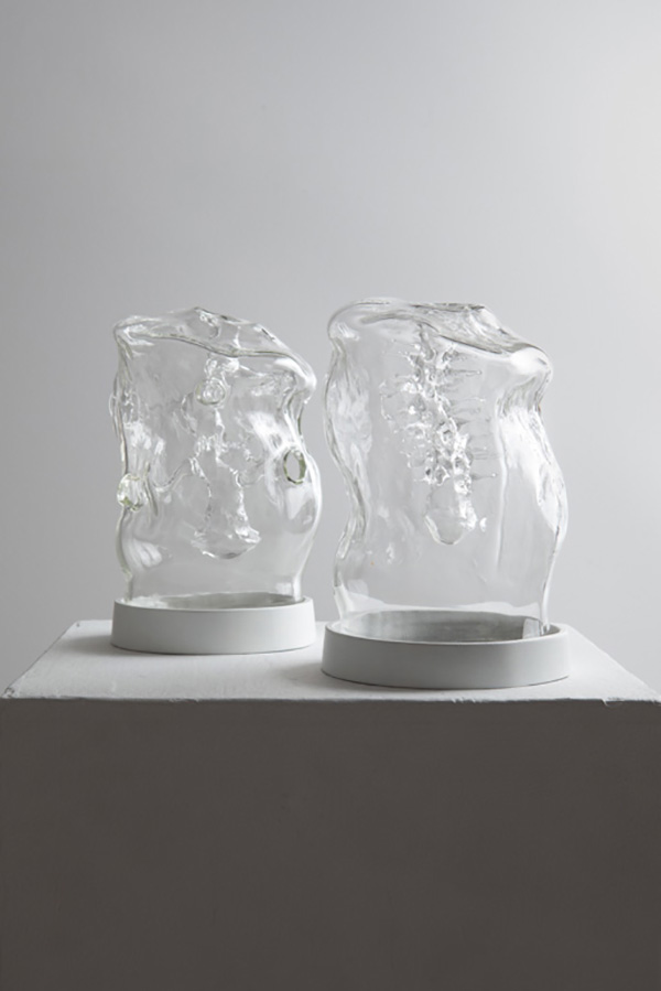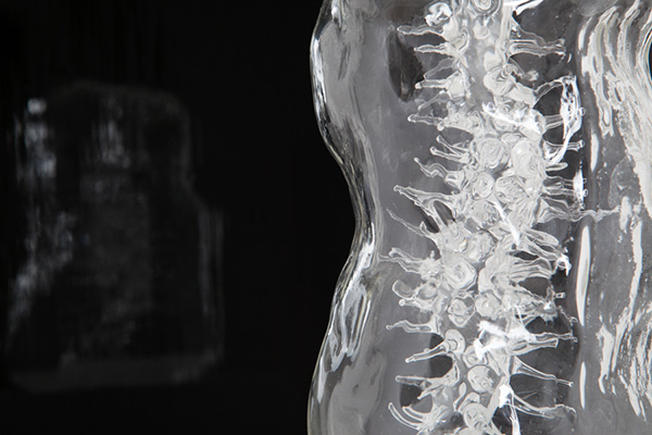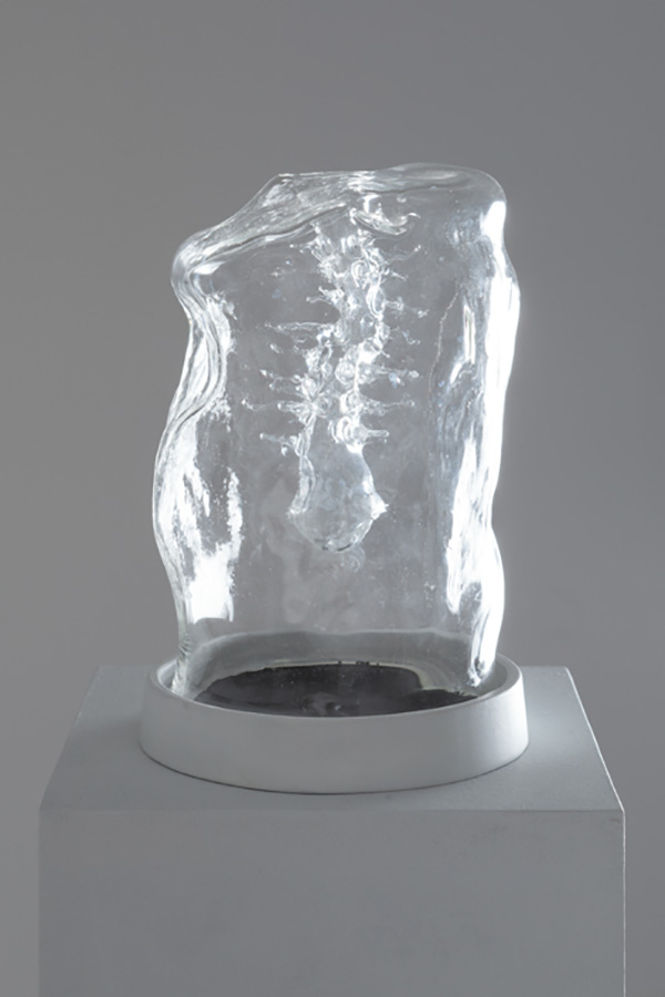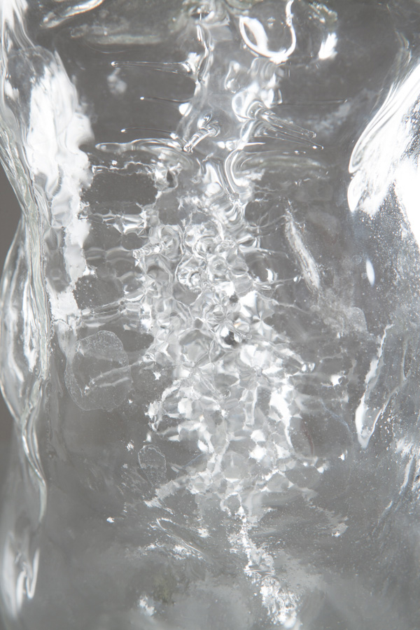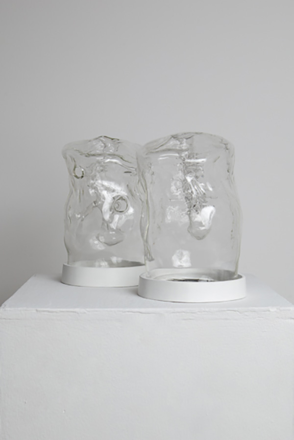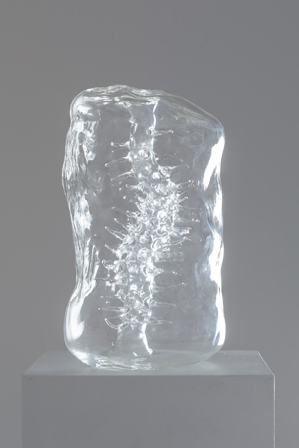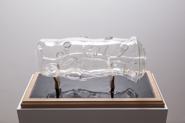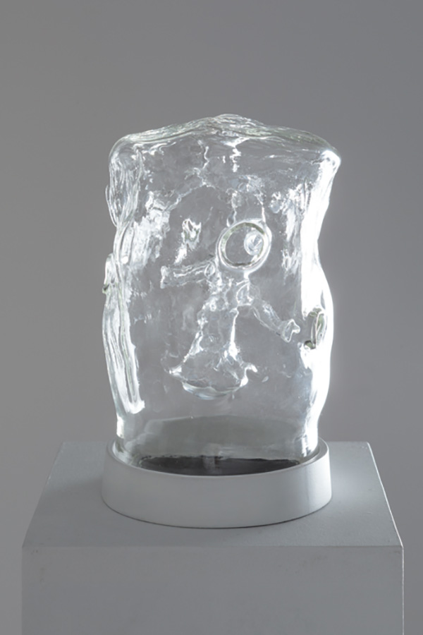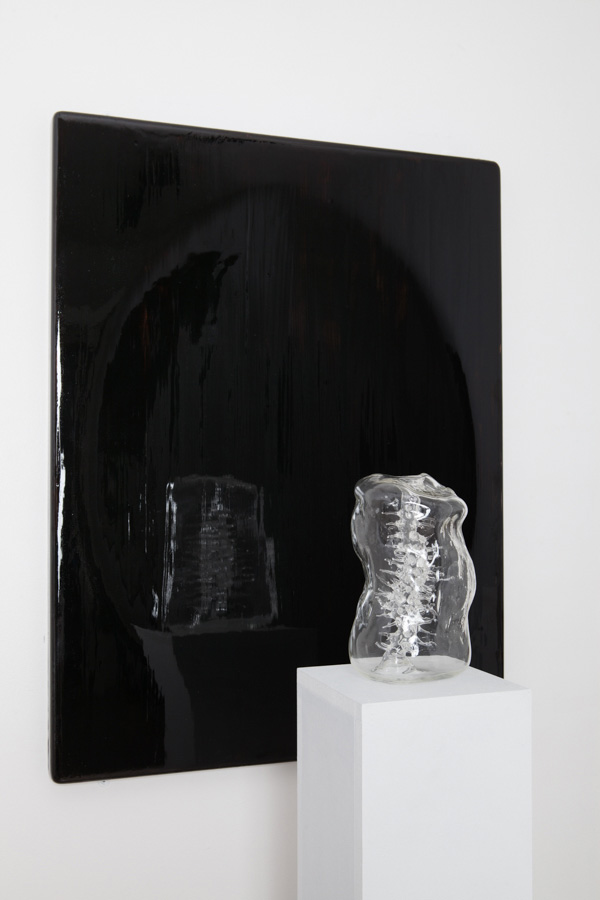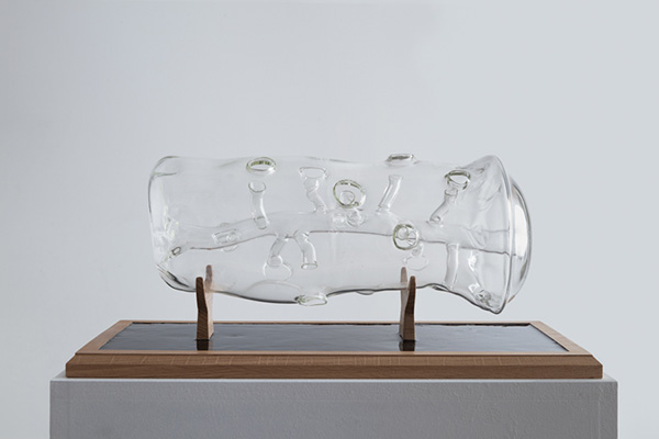 verre soufflé 13x13x20cm, bois sculpté verni, 60x80x3cm